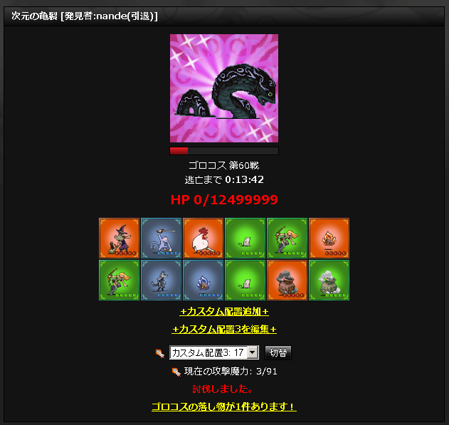 実はこの画面をある場所で公開したとき、「別のモンスター配置で撃破した後、配置だけNのに変えたんじゃないの」という趣旨の指摘をいただきました。